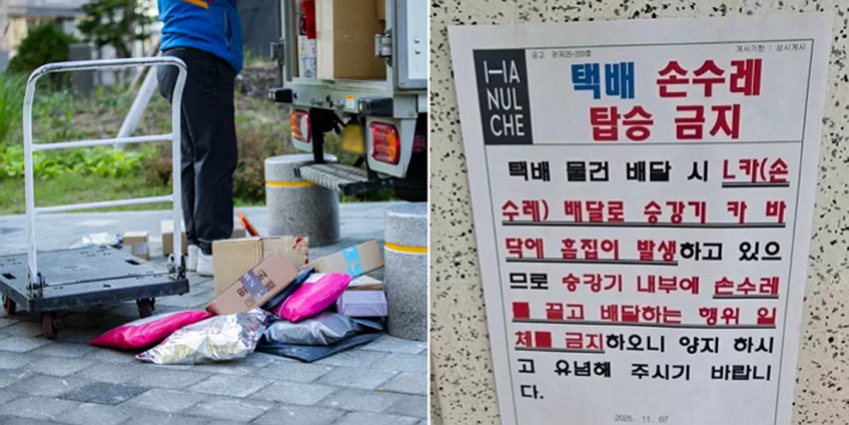 지난 5일 온라인 커뮤니티에 올라온 게시물에 따르면, 해당 아파트 관리사무소는 '승강기 내부에 손수레를 끌고 배달하는 행위를 일절 금지한다'는 안내문을 게시했습니다.