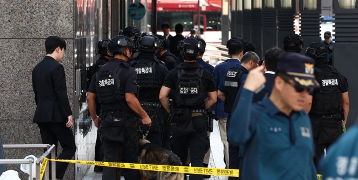 지난 8월 5일 오후 서울 신세계백화점 본점에서 한 인터넷 커뮤니티에 해당 백화점 내부에 폭발물을 설치했다는 협박글이 올라와 경찰특공대 등이 폭발물 수색을 마치고 이동하고 있다. / 뉴스1