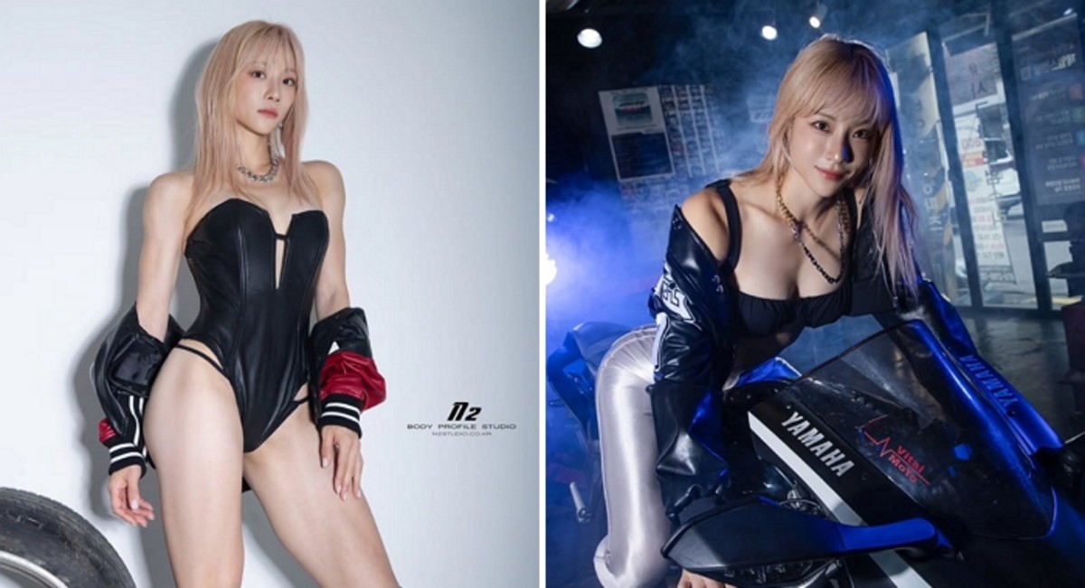 공개된 사진에서 심으뜸은 모터사이클 컨셉의 보디슈트와 롱부츠를 착용하고 타이어 소품을 배경으로 당당한 포즈를 연출했습니다.
