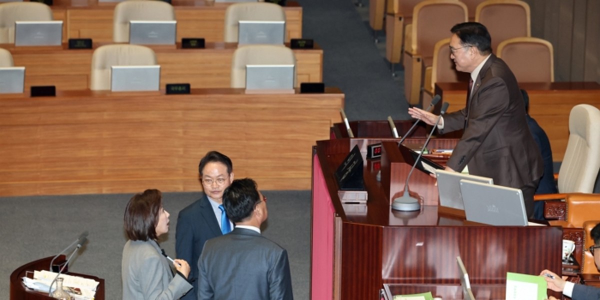9일 서울 여의도 국회에서 열린 제429회국회(정기회) 제16차 본회의에서 나경원 국민의힘 의원이 가맹사업법 개정안에 대한 무제한토론(필리버스터)을 하는 가운데 여야 원내수석과 우원식 국회의장이 대화하고 있다 / 뉴스1