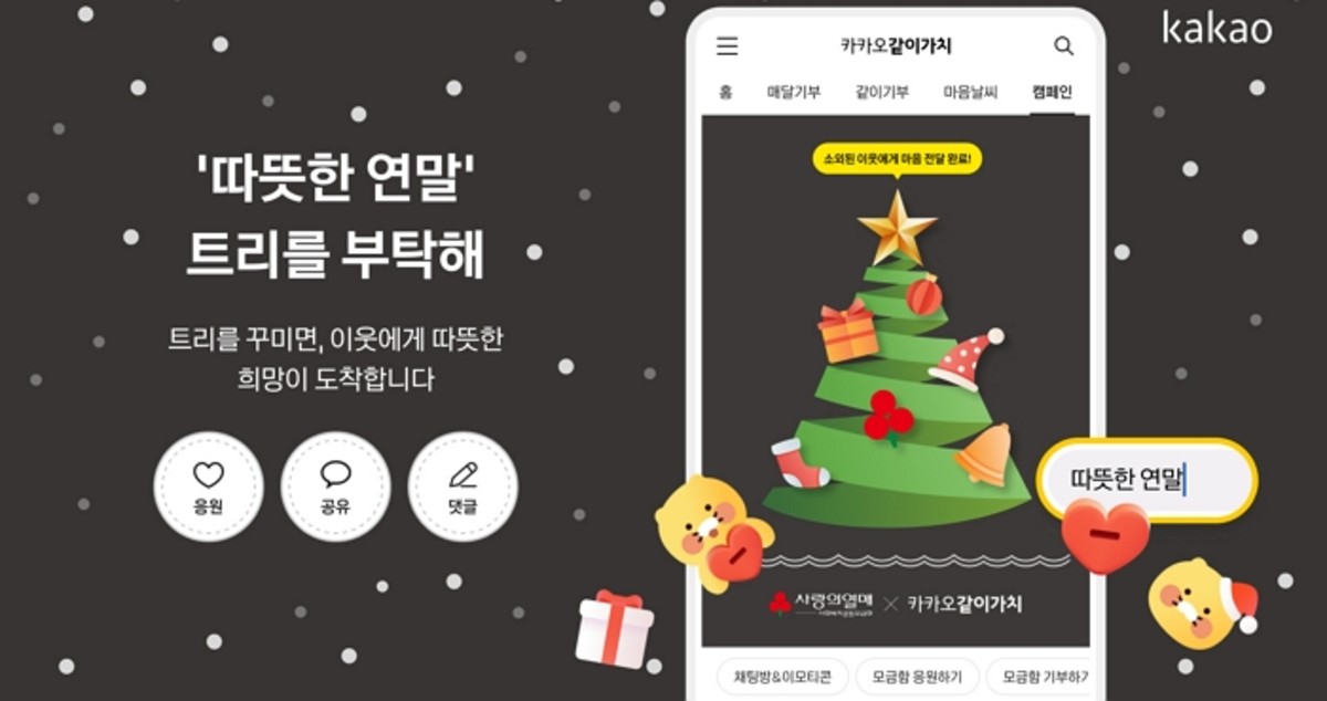 카카오같이가치는 '따뜻한 연말, 트리를 부탁해'라는 주제로 오는 19일까지 연말 기부 캠페인을 진행한다고 발표했습니다. 이번 캠페인은 참여자들이 다양한 기부 행동을 통해 크리스마스 트리를 완성해나가는 방식으로 구성됐습니다.