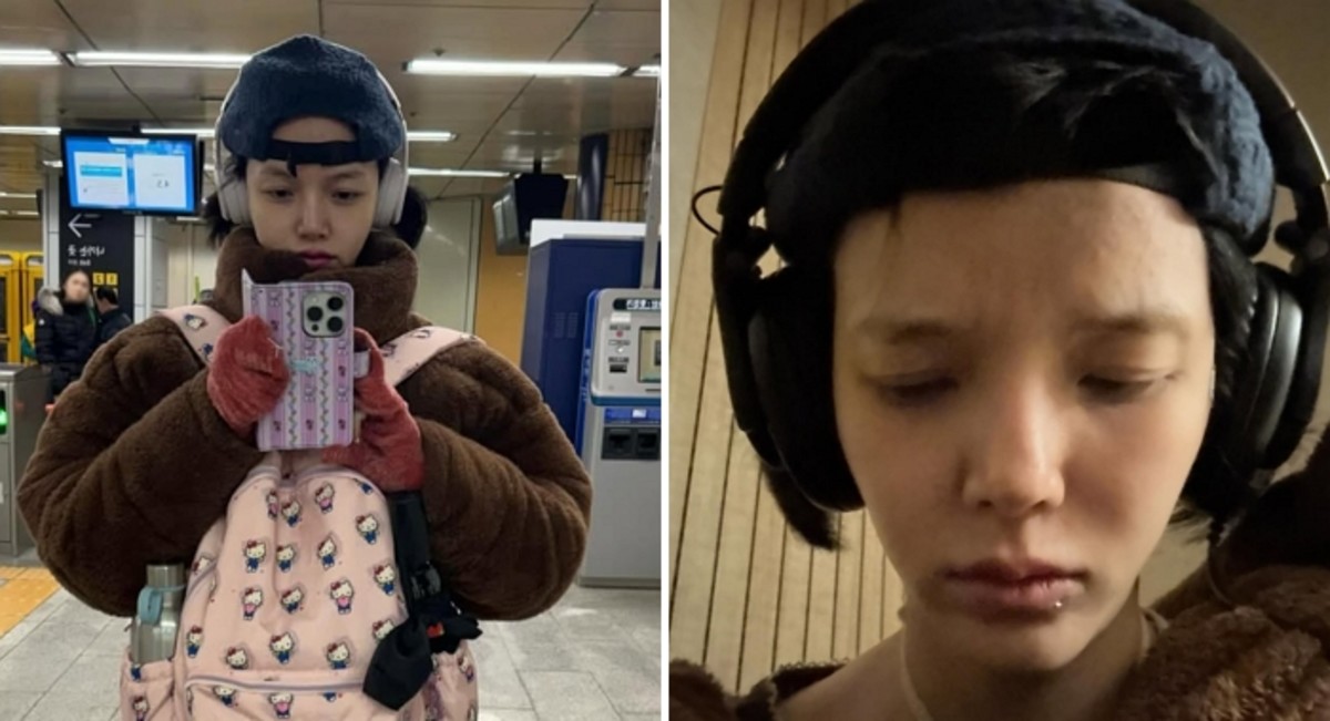 일상적인 모습도 함께 공개되었습니다. 지하철 역사에서 촬영한 거울 셀카에서는 네이비 볼캡과 헤드폰을 착용한 지민의 모습이 담겼습니다.