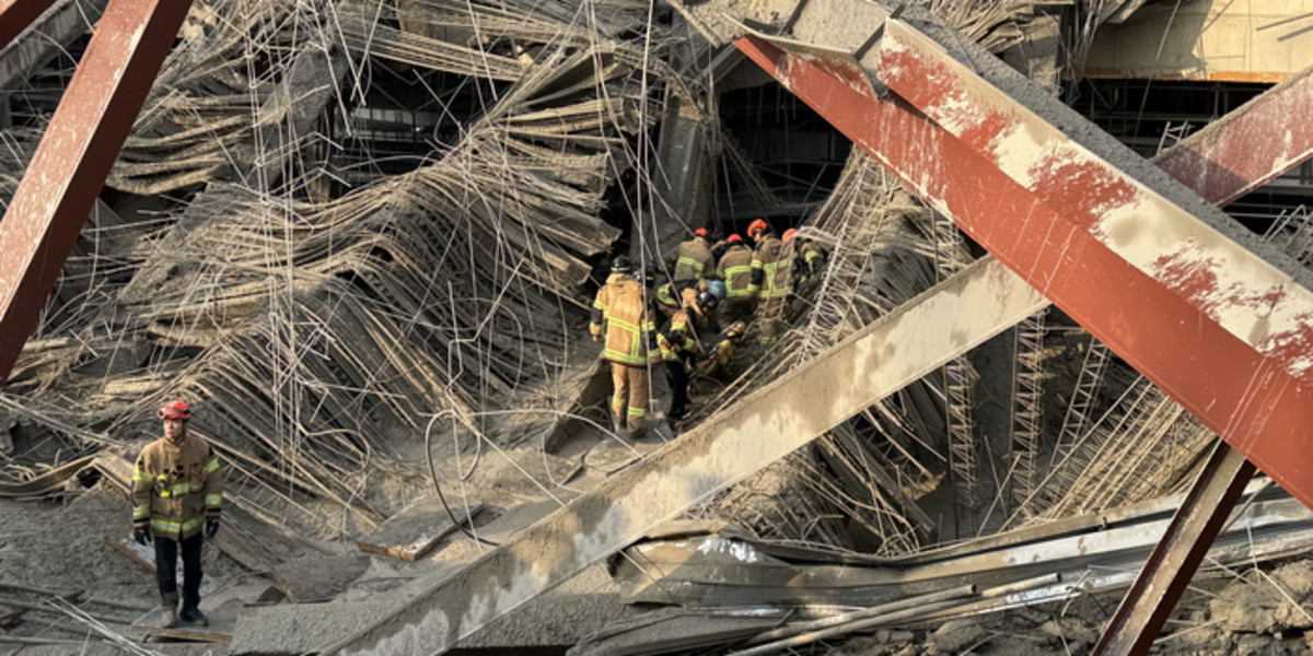 11일 오후 1시 58분쯤 광주 서구 치평동(상무지구)의 광주대표도서관 공사 현장에서 레미콘 타설 중 붕괴 사고가 발생해 4명이 매몰, 소방당국이 구조작업을 하고 있다 / 뉴스1