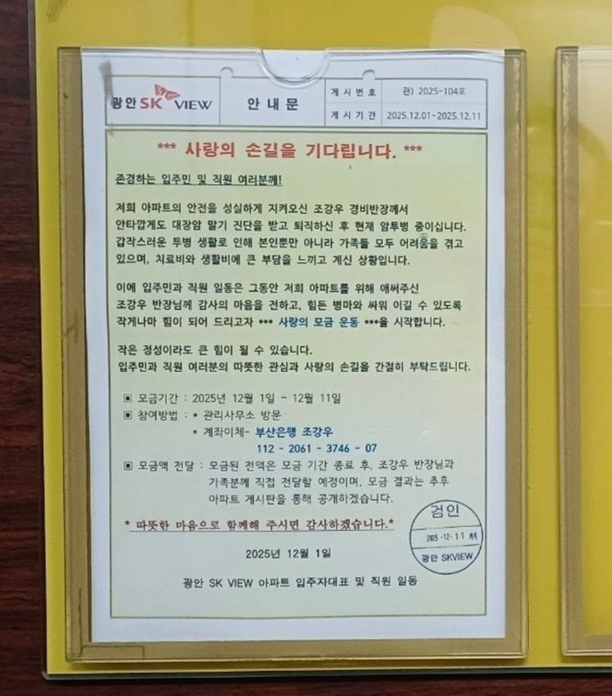 부산 수영구 광안 SK뷰 아파트 입주자대표회의와 관리사무소는 최근 조강우 경비반장을 위한 모금 운동을 진행했다고 발표했습니다. 조 반장은 2014년 6월부터 올해 10월까지 약 11년간 이 아파트에서 경비반장으로 근무하다가 대장암 말기 판정을 받고 퇴직한 상황이었습니다.