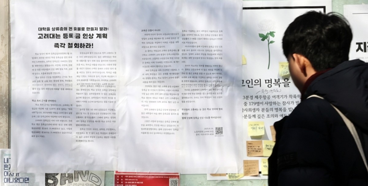 최근 대학 등록금을 인상하겠다는 대학가의 움직임이 전국적으로 확산하고 있는 가운데 17일 서울 성북구 고려대학교 학내 게시판에 등록금 인상 반대의 내용이 담긴 대자보가 붙어 있다. 2025.1.17 / 뉴스1