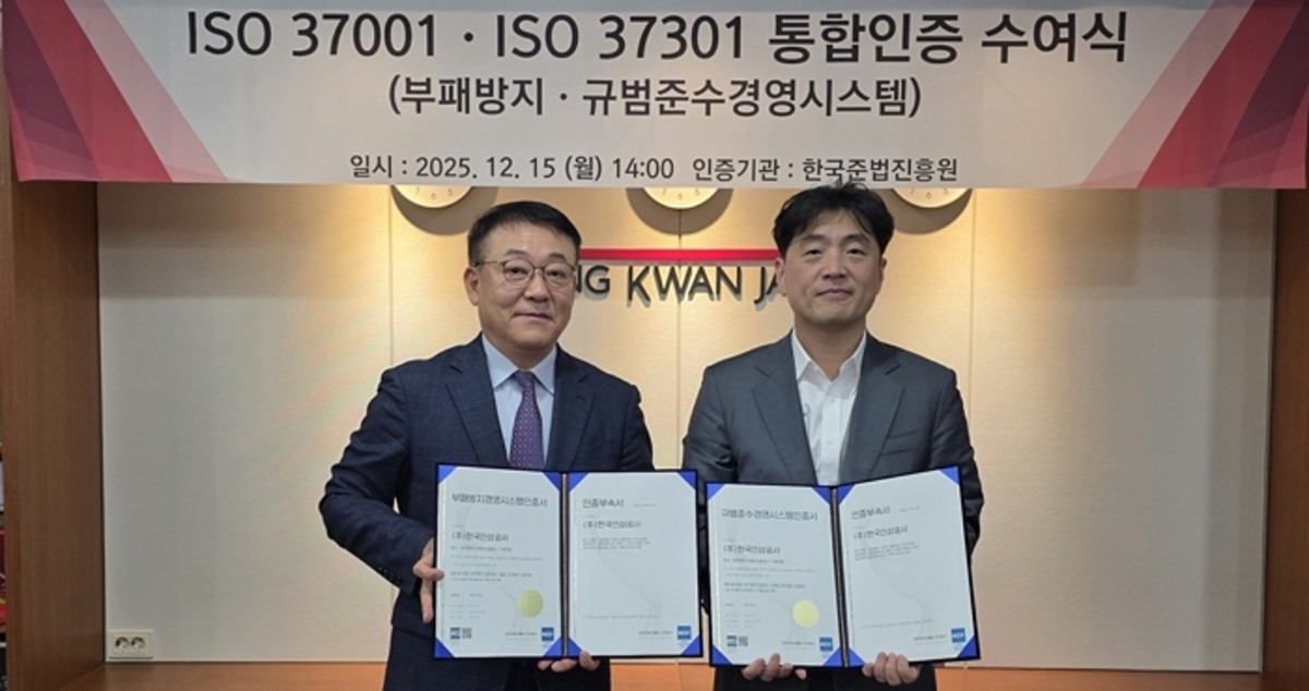 KGC인삼공사가 한국준법진흥원으로부터 규범준수경영시스템과 부패방지경영시스템 통합인증을 받았습니다. ISO 37301은 국제표준화기구가 제정한 컴플라이언스 관리 시스템 국제표준입니다.