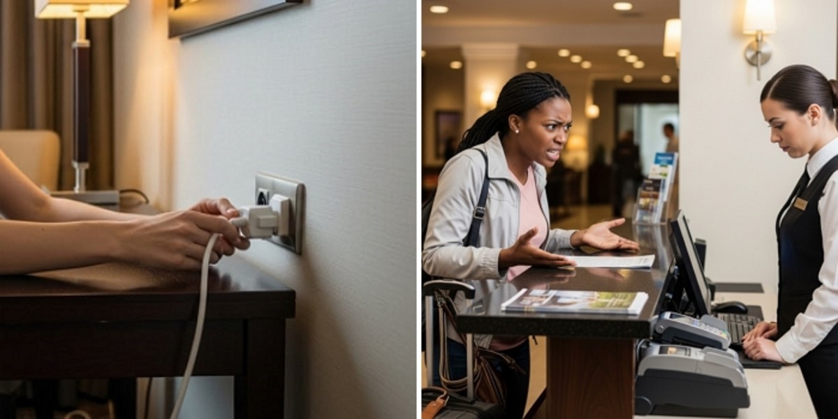 그년느 호텔 객실에 체크인한 후 아들의 휴대전화를 충전하려고 콘센트에 꽂혀있는 플러그를 뽑아 사용했습니다.