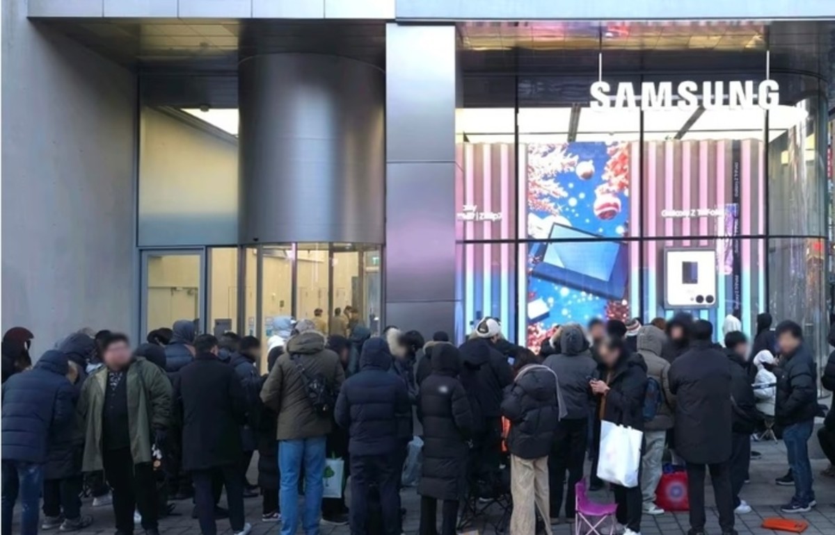12일 삼성 강남 외부에서 '갤럭시 Z 트라이폴드'를 구매하기 위해 대기하고 있는 고객들