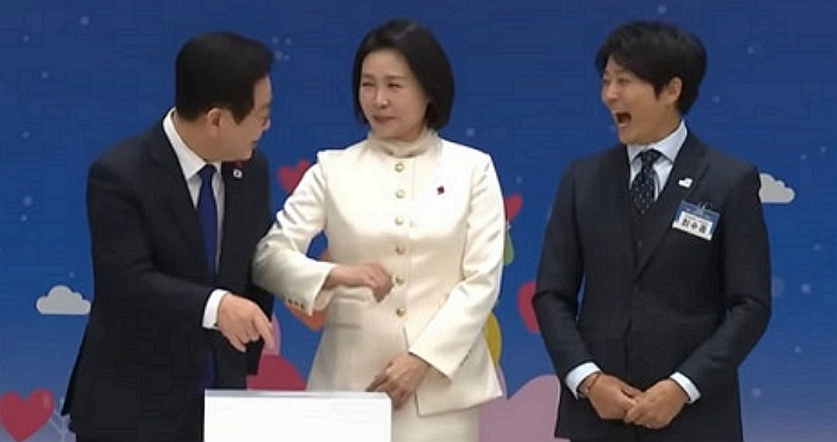 진행자가 "어! 대통령님, 사진 찍으실 때 잠시만 멈춰주시면 감사하겠습니다. (봉투가) 쑥 들어갔습니다"라고 말하자, 이재명 대통령은 실수를 깨닫고 자신의 이마에 손을 갖다 대며 웃었습니다. 김혜경 여사가 이재명 대통령의 옆구리를 '쿡' 찌르는 모습을 본 최수종은 눈을 질끈 감으며 웃음을 참지 못했습니다.