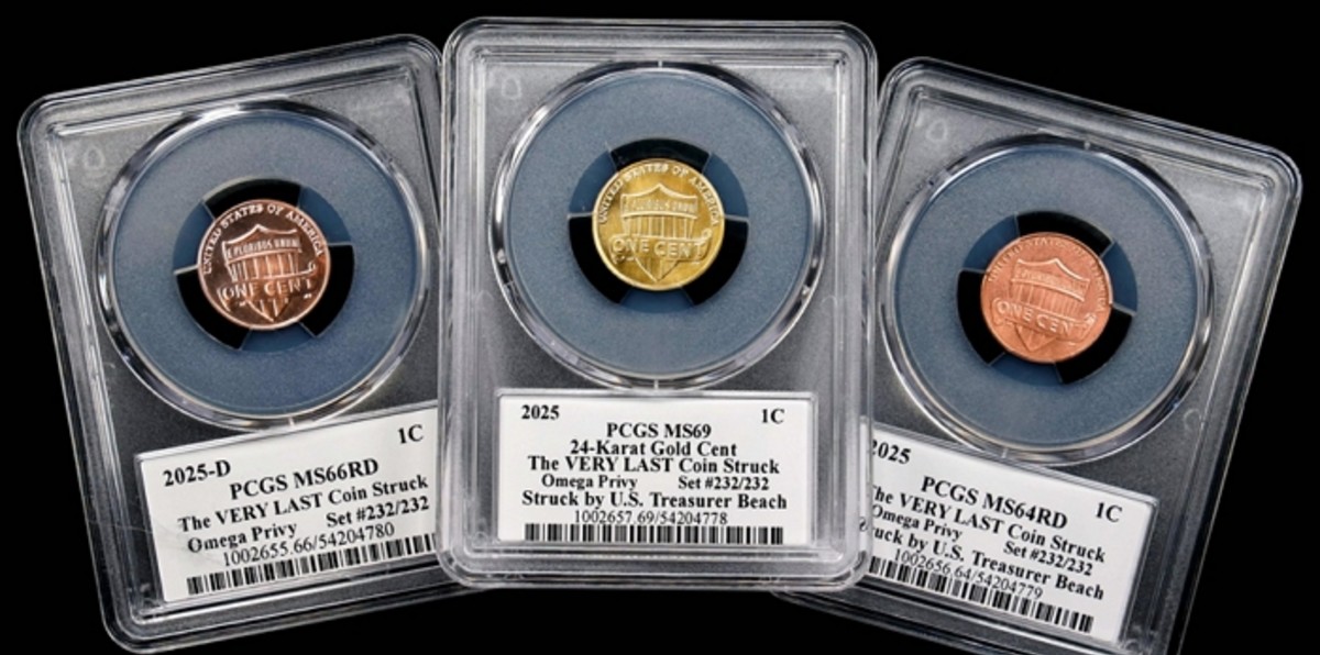경매에 나온 1센트 동전 세트는 지난달 필라델피아 조폐국에서 발행된 일반 1센트 동전과 순금 재질의 1센트 동전, 덴버 조폐국 제작 1센트 동전 등 3종으로 구성되었습니다. 각 동전에는 마지막 생산분임을 나타내는 '오메가'(Ω) 마크가 양각되어 있어 희소성을 더했습니다.