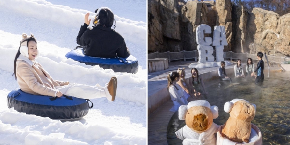 귀여운 카피바라 캐릭터 테마로 꾸며진 실내외 스파, 사우나뿐만 아니라 550미터 길이의 유수풀 전구간도 따뜻하게 운영돼 겨울 힐링 물놀이를 즐기기에 제격입니다.
