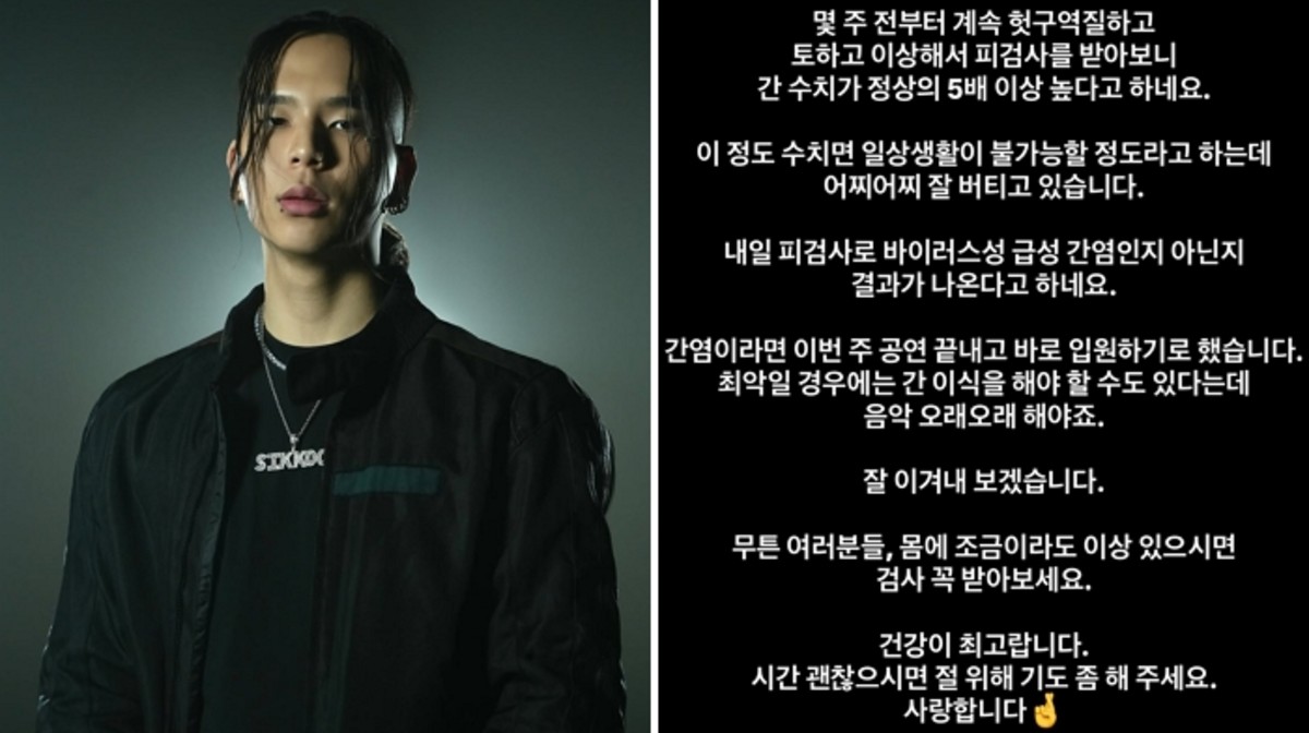 그는 "몇 주 전부터 계속 헛구역질하고 토하고 이상해서 피검사를 받아 보니 간 수치가 정상의 5배 이상 높다고 한다"며 충격적인 검사 결과를 공개했습니다.