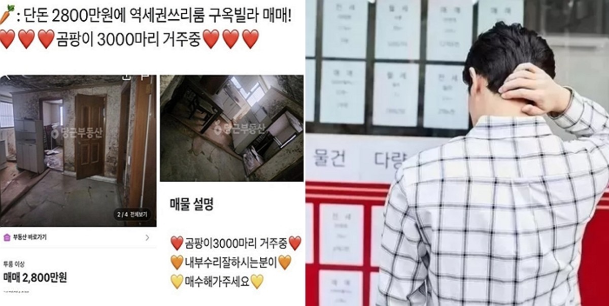 공개된 이미지에 따르면 판매자는 "단돈 2800만원에 역세권 스리룸 구옥빌라 매매"라고 소개하면서 "곰팡이 3000마리 거주중"이라는 설명을 추가했습니다. 또한 "내부 수리 잘하시는 분이 매수해 가달라"는 당부의 말도 함께 적었습니다.