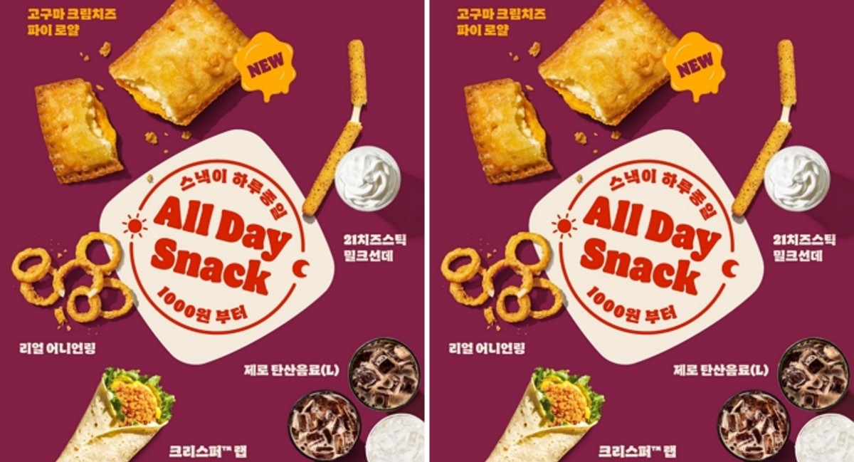 그 밖에도 올데이스낵에는 ▲리얼 어니언링 레귤러(2,000원) ▲크리스퍼 랩(2,500원) ▲밀크선데(1,500원) ▲코카콜라 제로·스프라이트 제로·닥터 페퍼 제로 라지(각 1,000원) 등 총 8종의 메뉴가 포함됩니다.