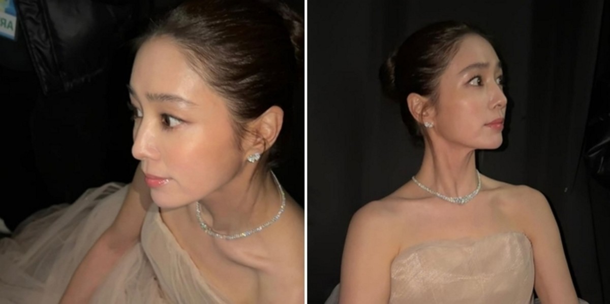 베이지 톤의 실크 원피스를 입고 올백 헤어스타일을 연출한 그는 우아함과 세련미를 겸비한 또 다른 면모를 드러냈습니다. 특히 클로즈업 샷에서도 흠잡을 데 없는 매끈한 피부와 완벽한 이목구비가 돋보였습니다.