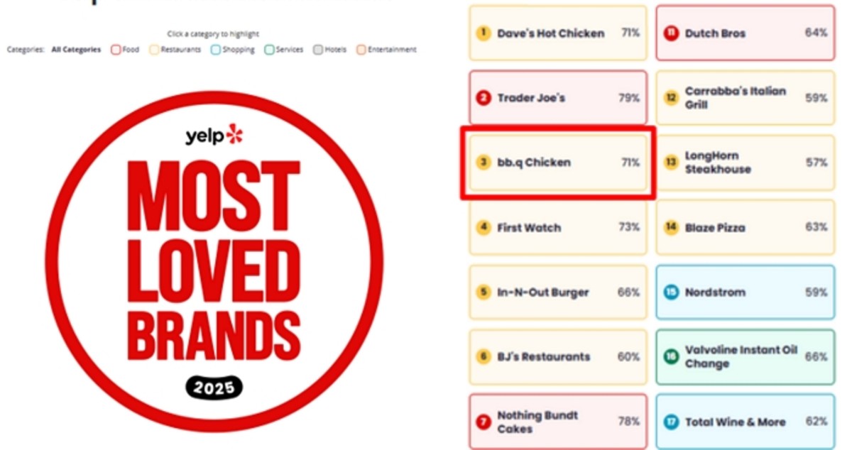 제너시스BBQ 그룹이 운영하는 BBQ 치킨이 미국 최대 로컬 리뷰 플랫폼 옐프에서 발표한 '미국에서 가장 사랑받는 브랜드' 순위에서 전체 3위를 차지했습니다.
