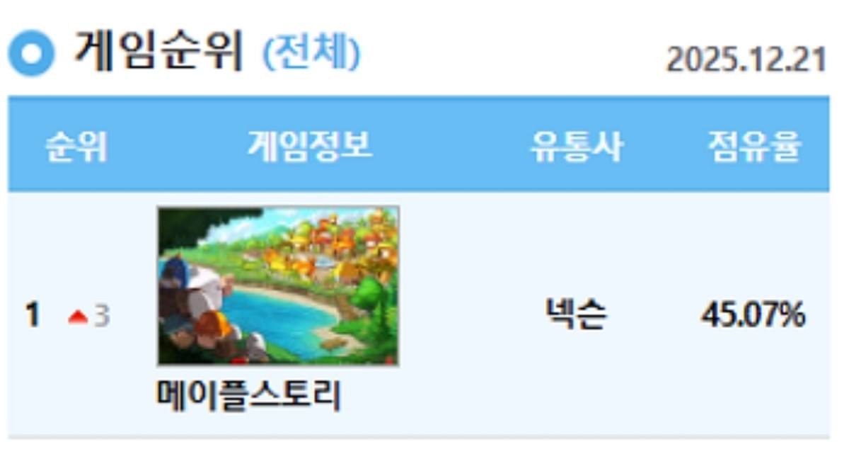 특히 이번 45.07% 점유율은 '메이플스토리'가 지난 2003년 서비스를 시작한 이후 22년 만에 달성한 역대 최고 순위로 기록됩니다.