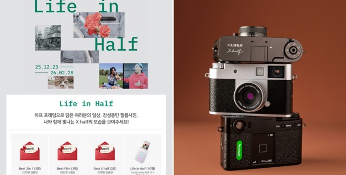 23일 후지필름일렉트로닉이미징코리아는 디지털 하프 프레임 카메라 'X half'의 매력을 알리는 'Life in Half' 이벤트를 개최한다고 발표했습니다.