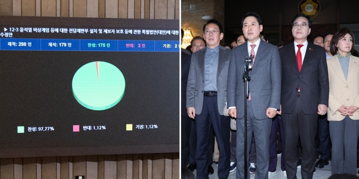 3일 서울 여의도 국회에서 열린 제430회국회(임시회) 제2차 본회의에서 12·3 윤석열 비상계엄 등에 대한 전담재판부 설치 및 제보자 보호 등에 관한 특별법안(대안) 수정안이 찬성 175표, 반대 2표, 기권 2표로 통과되고 있다 / 뉴스1