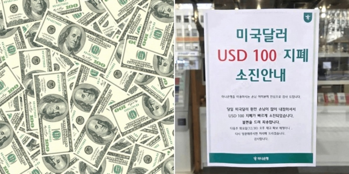 지난 24일 금융권에 따르면 서울 강남 소재 하나은행 지점 한 곳은 24일 미화 100달러 지폐 재고가 모두 소진됐다고 발표했습니다.