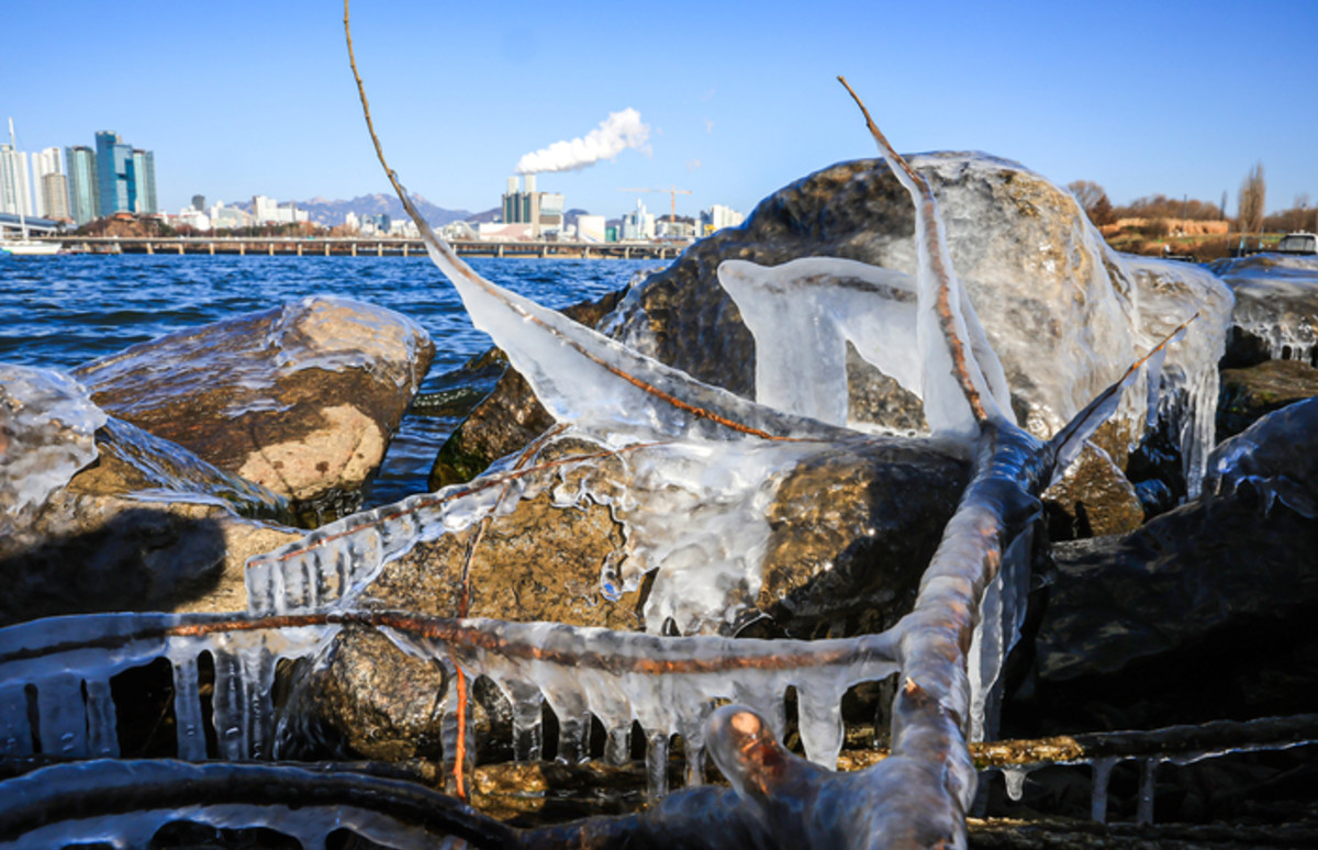 한낮에도 영하권 추위가 이어지는 26일 오후 서울 영등포구 여의도 인근 한강에 고드름이 얼어있다. 기상청은 주말인 27일 아침까지 영하 10도 안팎의 추위가 이어질 것으로 예보했다. 2025.12.26/뉴스1
