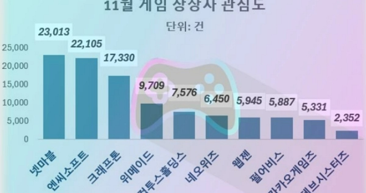이 외에도 위메이드가 9709건, 컴투스홀딩스가 7576건, 네오위즈가 6450건, 웹젠이 5945건, 펄어비스가 5887건, 카카오게임즈가 5331건, 데브시스터즈가 2352건 순으로 집계됐습니다.
