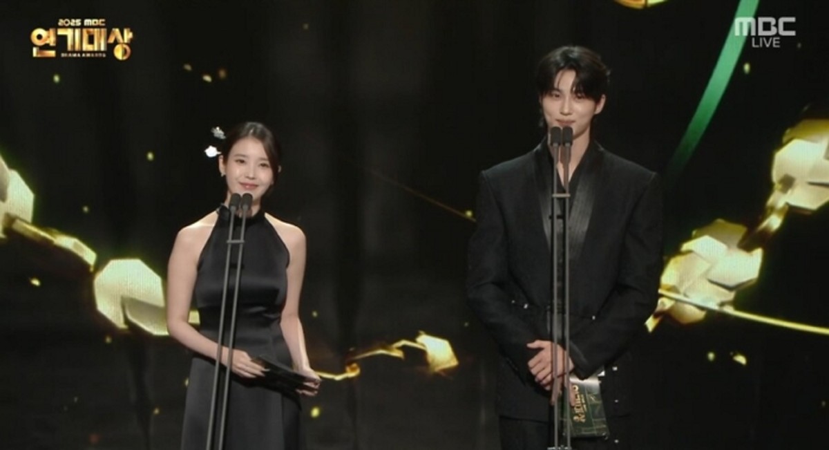 상암동 MBC 미디어센터 공개홀에서 개최된 '2025 MBC 연기대상' 시상식에서 내년 방영 예정 드라마 '21세기 대군부인'의 주연 배우 아이유와 변우석이 시상자로 나서며 첫 공식 투샷을 공개했습니다.