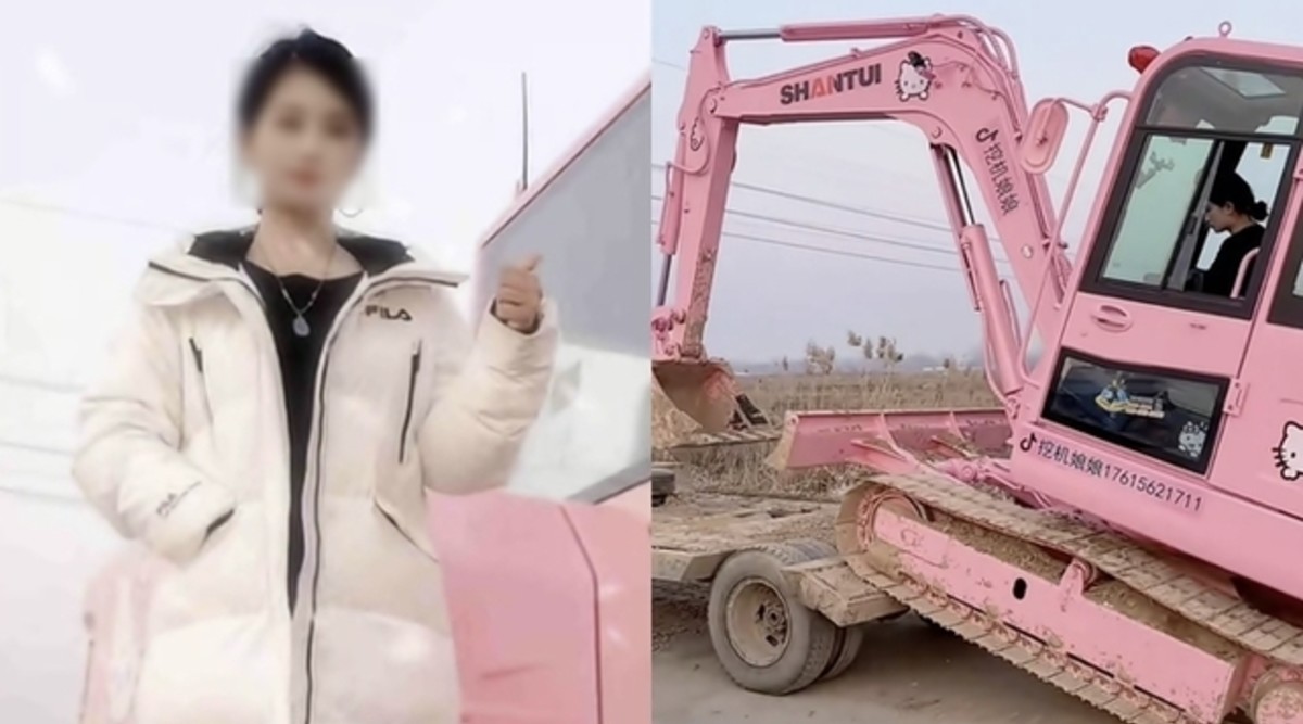 핑크색 헬로키티 굴착기로 온라인에서 '굴착기 여왕'이라는 별명을 얻으며 주목받고 있는 중국여성 / SCMP
