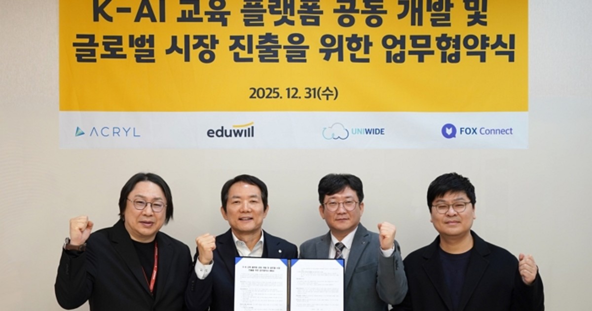 5일 에듀윌은 지난 31일 AI 전문기업 아크릴, IT 인프라 전문기업 유니와이드, 미래교육 플랫폼 기업 폭스커넥트와 'K-AI 교육 플랫폼 공동 개발 및 글로벌 시장 진출을 위한 업무협약'을 체결했다고 발표했습니다.
