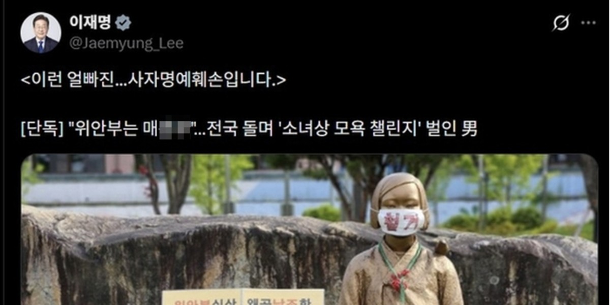 이 대통령이 공유한 게시물에는 전국 각지를 돌아다니며 평화의 소녀상에 마스크나 검은 천을 씌우는 행위를 벌인 극우단체에 대해 경찰이 수사에 나섰다는 보도 내용이 포함되어 있었습니다.