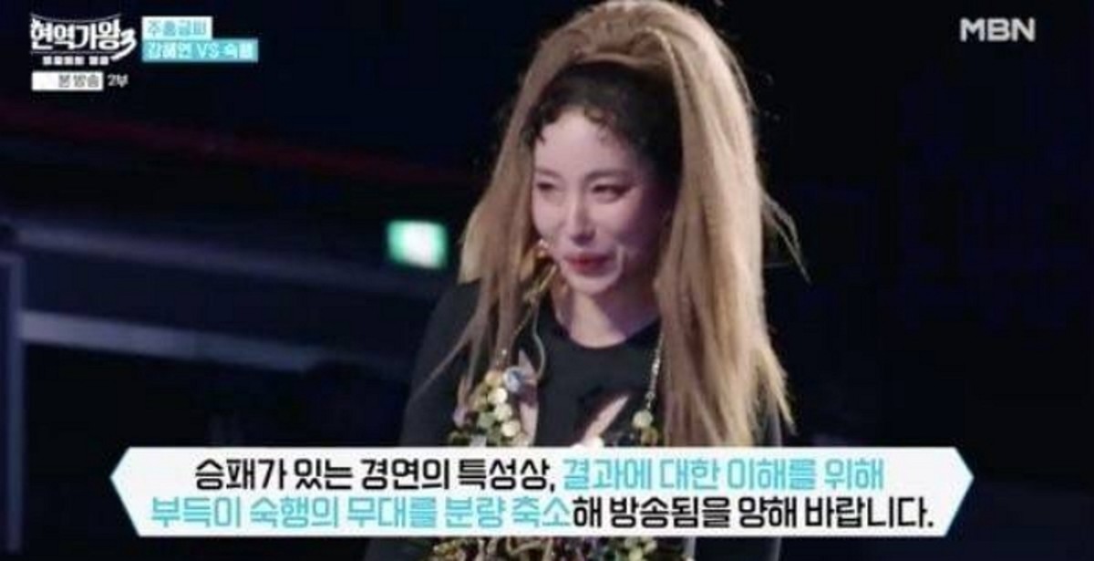 제작진은 추가 자막을 통해 "본선 1차 숙행의 무대는 시청자 정서를 고려해 고심 끝에 부득이 편집했다"고 설명했습니다. 방송에서는 숙행이 강혜연과의 대결에서 승리했다는 간단한 설명만 전해졌습니다.