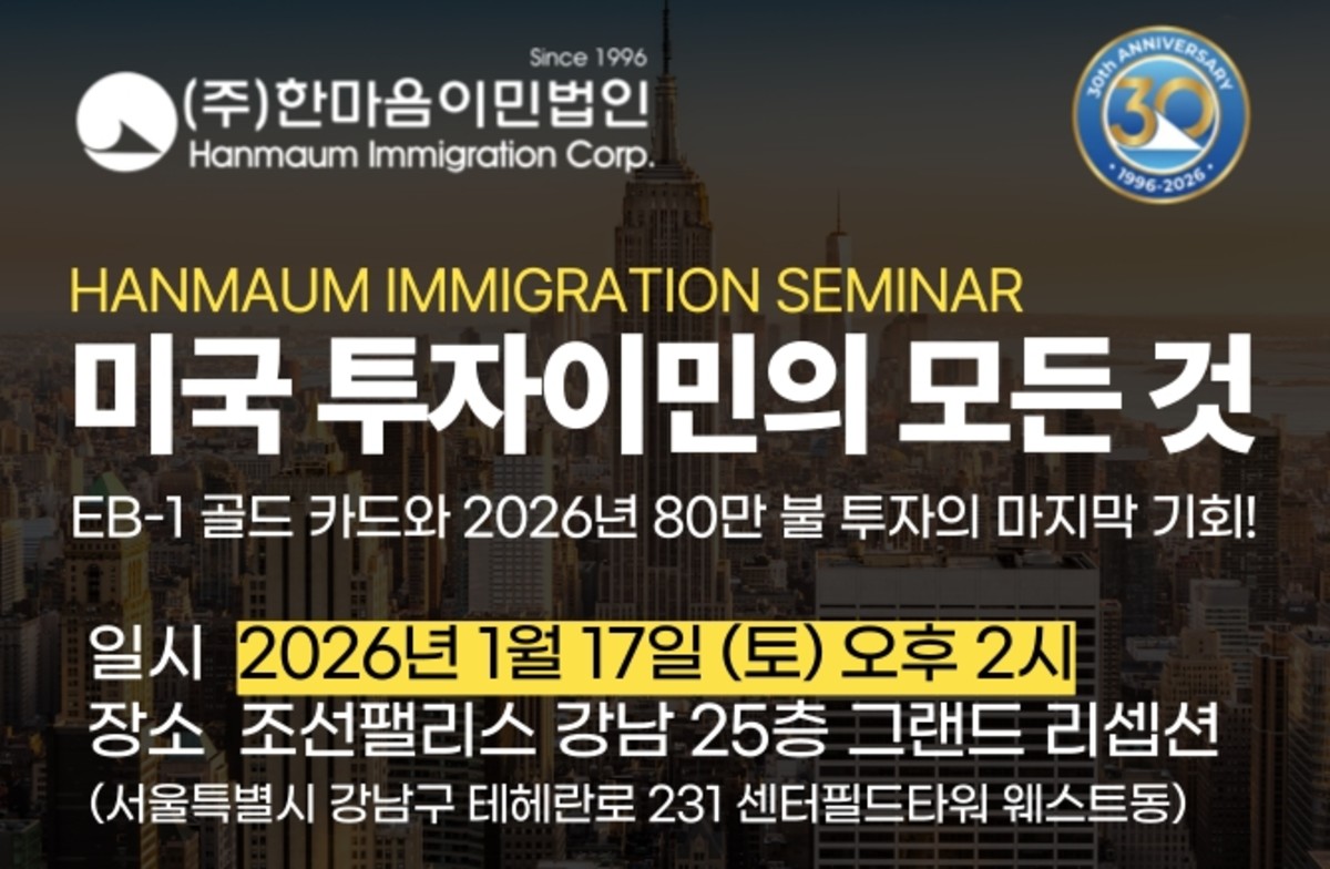 오후 2시에 진행되는 세미나에서는 2026년 주목해야 할 이민 정책과 전략 및 FAQ를 비롯해 개인별 맞춤 컨설팅, 트럼프 골드카드 프로그램, 미국 투자이민(EB-5)의 투자금 인상 전망 등이 다뤄집니다. 특히 EB-5 개혁 및 청렴법 시한이 임박한 상황에서 최신 미국 투자이민 가이드가 집중적으로 소개될 예정입니다.