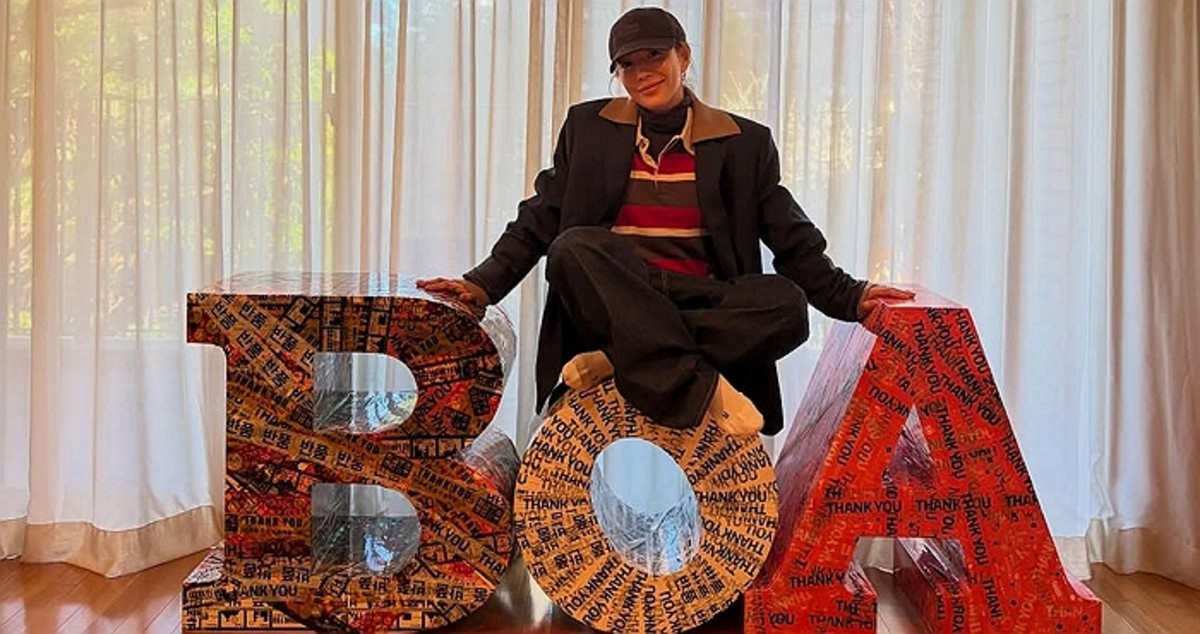 공개된 사진에는 보아가 자신의 이름 'BoA'로 제작된 대형 조형물 위에 앉아 환한 미소를 짓고 있는 모습이 담겨 있습니다.