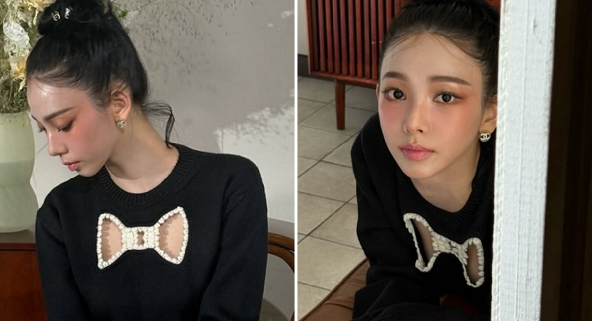 특히 눈길을 끈 것은 가슴 부분에 리본 모양의 컷아웃 디테일이 있는 블랙 니트 톱이었습니다. 카리나는 이 과감한 디자인의 의상을 통해 절제된 섹시함과 청순한 아름다움을 동시에 표현해냈습니다. 블랙과 아이보리 컬러를 활용한 세련된 코디네이션은 그녀만의 우아한 아우라를 더욱 부각시켰습니다.
