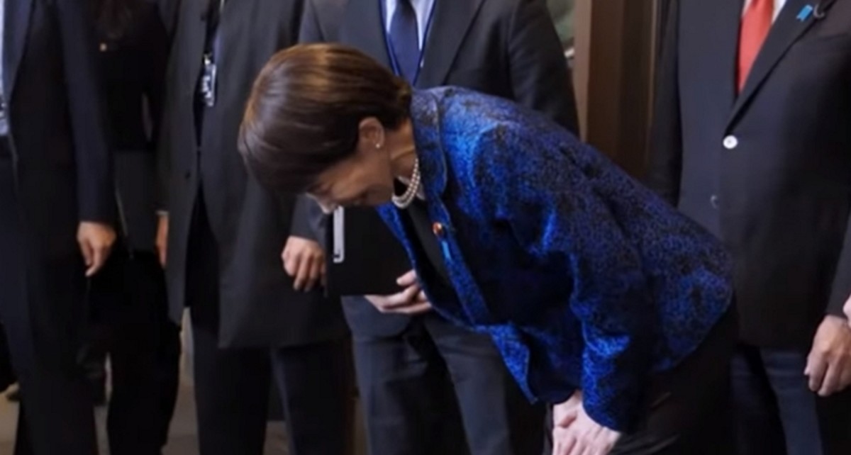 지난 13일 다카이치 사나에 일본 총리가 이재명 대통령에게 90도 각도로 인사하는 모습. / 글로벌타임스