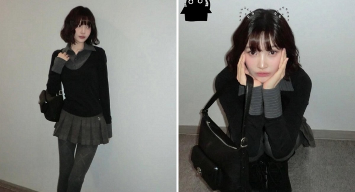 공개된 이미지에서 조이는 다크 그레이 톤의 셔츠 레이어드 니트와 짧은 플리츠스커트를 조합한 스쿨룩 패션으로 청순한 매력을 발산했습니다.