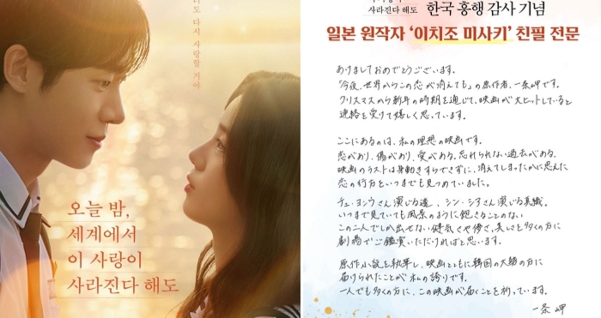일본 베스트셀러 소설을 원작으로 한 영화 '오늘 밤, 세계에서 이 사랑이 사라진다 해도'가 한국에서 큰 성공을 거두자, 원작자가 직접 감사 인사를 전했습니다.