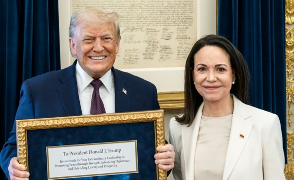널드 트럼프 미국 대통령(왼쪽)과 베네수엘라 야권 지도자 마리아 코리나 마차도가 노벨평화상 메달이 포함된 금색 액자를 함께 들고 있다. / 백악관 X