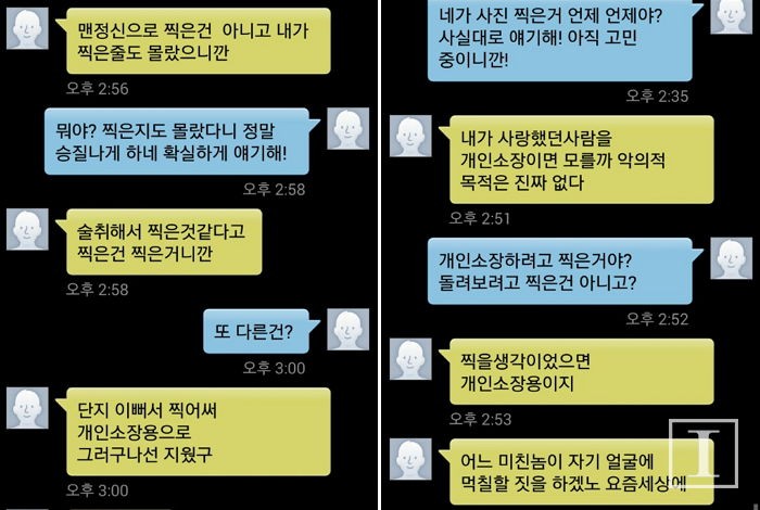 전 남자친구 B씨는 A씨에게 보낸 문자에서 "맨정신으로 찍은 건 아니고 찍은 줄도 몰랐다"며 "단지 예뻐서 개인 소장용으로 찍었고 지웠다"고 변명했다.