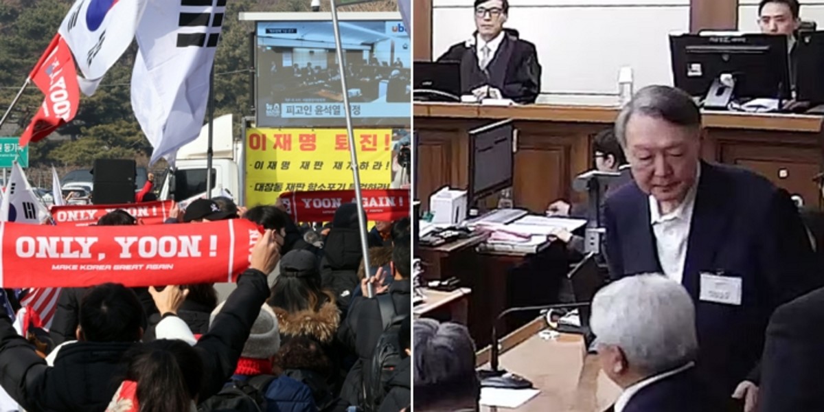 16일 오후 서울 서초구 서울중앙지법 앞에서 윤 전 대통령 지지자들이 TV를 통해 생중계를 지켜보고 있다. / 뉴스1