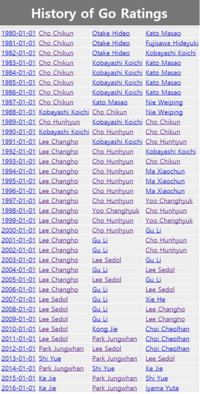 최근 온라인 커뮤니티에서는 외국 사이트 고 레이팅스(Go Ratings)에서 발표한 1980년 이후 바둑 세계랭킹 1등 선수들의 목록이 화제다.