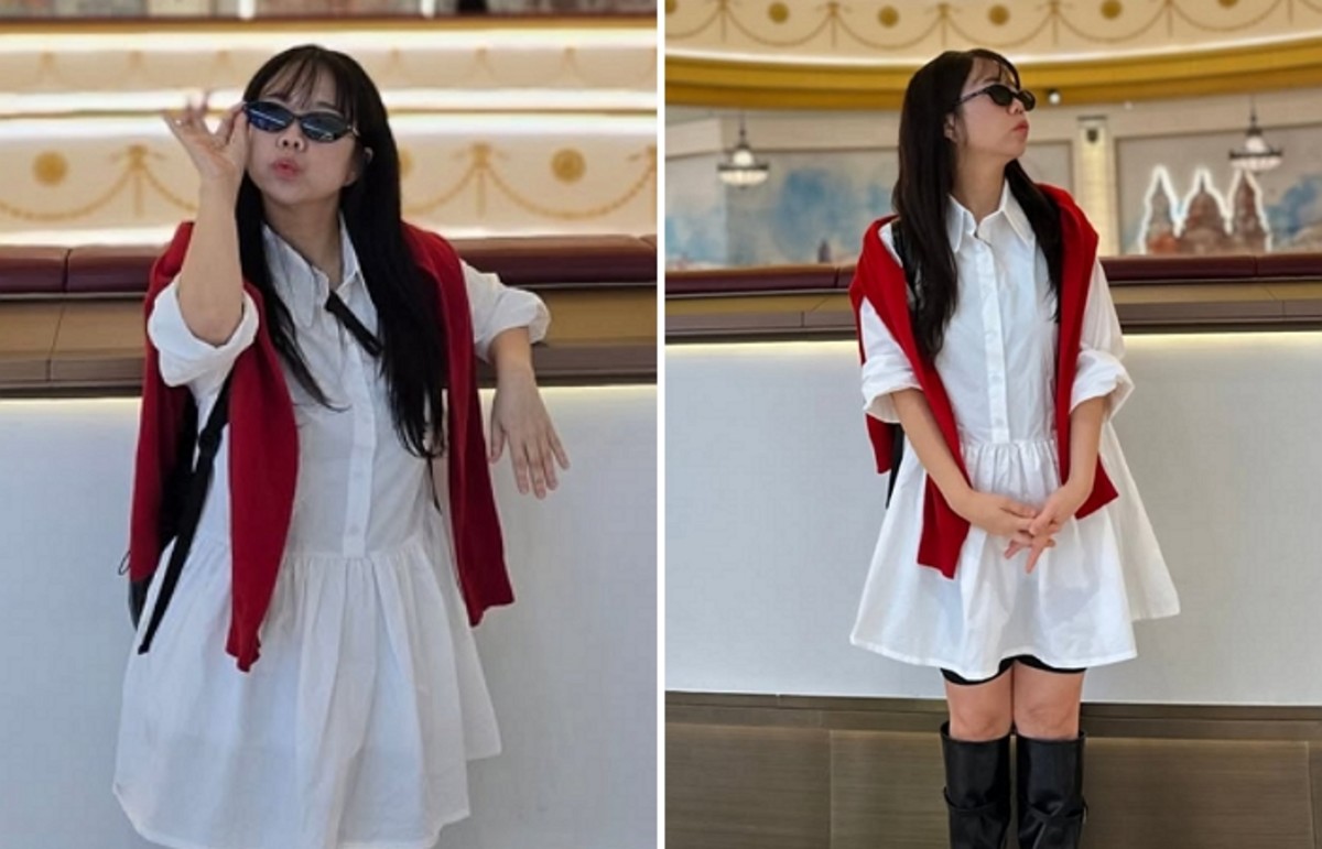 홍현희는 셔츠형 미니 원피스와 롱부츠를 조합한 스타일링으로 발랄하고 상큼한 매력을 선보였습니다.