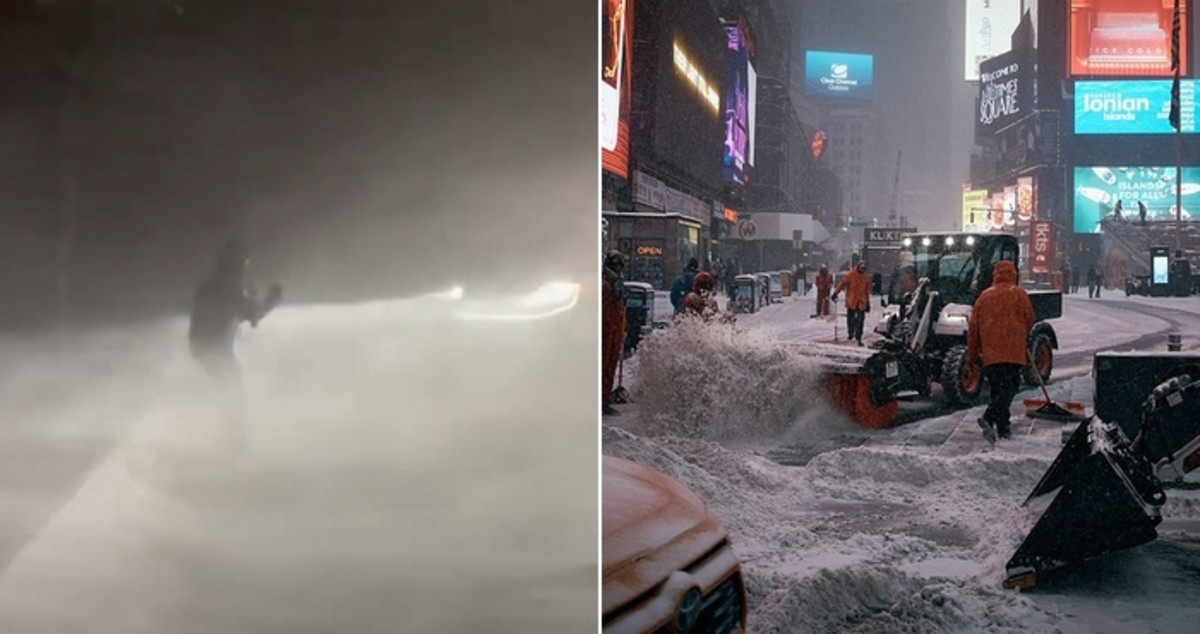 지난 25일 뉴욕시 타임스퀘어에서 작업자들이 눈을 치우고 있다 / GettyimagesKorea