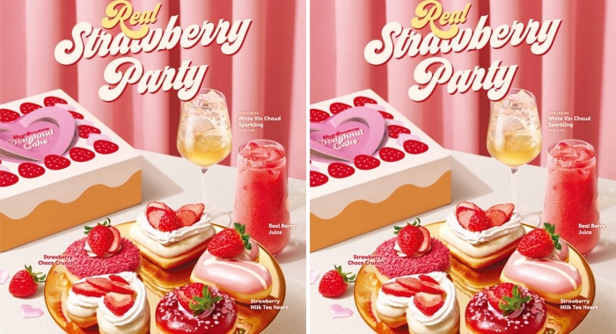 ▲스트로베리크림 하트 ▲스트로베리밀크티 하트 ▲스트로베리팝핑 링 ▲스트로베리초코 크런치 도넛 4종과 ▲리얼베리주스 ▲화이트뱅쇼 스파클링 음료 2종으로 판매합니다. 고객 만족을 위해 신제품에 모두 생딸기를 넣어 딸기의 풍미를 느낄 수 있습니다.