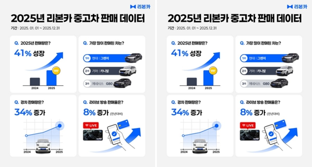 비대면 직영인증중고차 플랫폼 리본카가 발표한 지난 2025년 판매 실적에 따르면, 전체 판매량이 전년 대비 41% 급증한 것으로 나타났습니다.