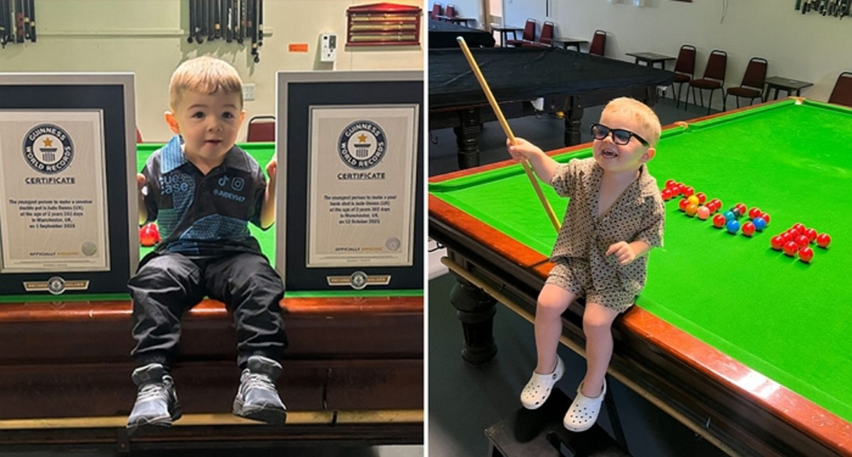 영국의 두 살배기 당구 신동이 고난도 당구 기술을 성공하며 기네스 세계 기록을 세웠습니다.