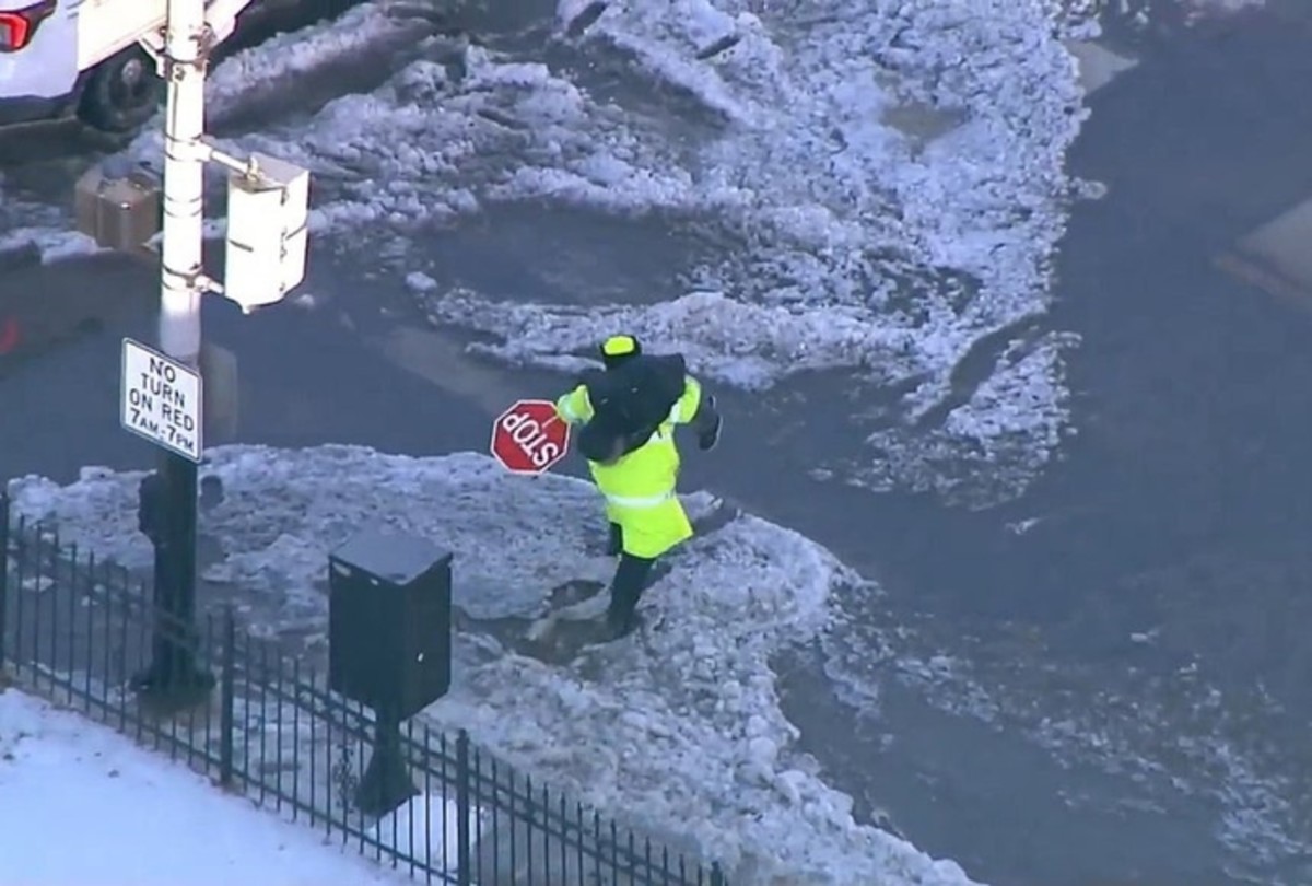 미국 시카고에서 수도관 파열로 물바다가 된 도로에서 한 안전요원이 학생을 어깨에 메고 횡단보도를 건너는 훈훈한 모습이 화제가 되고 있습니다.