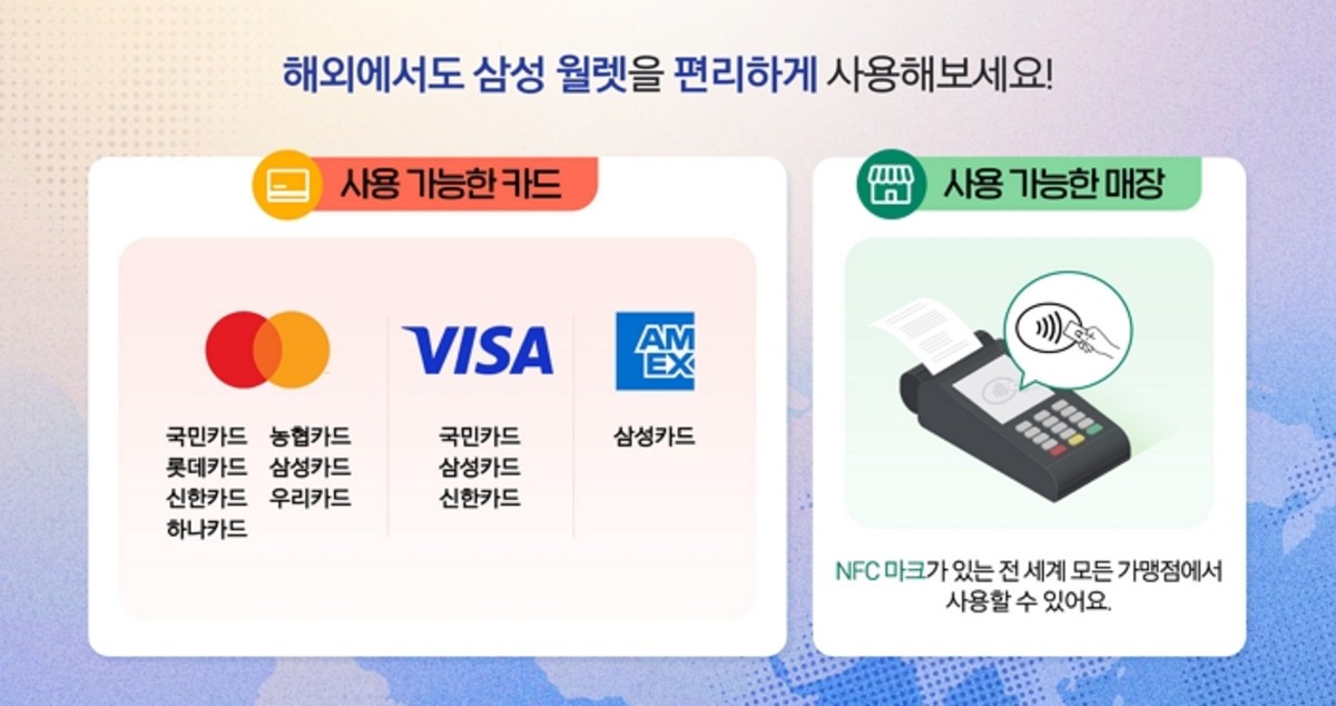 삼성 월렛 사용자들은 기존 마스터카드, 비자 카드에 이어 아멕스 카드로도 해외에서 실물 카드 없이 간편결제를 이용할 수 있게 됩니다.