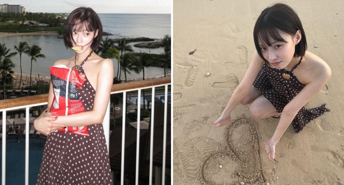 도트 패턴의 홀터넥 원피스를 착용한 윈터는 발코니에서 바다를 바라보며 과자를 즐기는 모습을 선보였습니다. 특히 등 부분이 파인 디자인의 원피스가 그의 슬림한 체형을 더욱 돋보이게 했습니다. 야자수와 해변이 보이는 배경은 하와이 등 열대 휴양지임을 짐작케 했습니다.