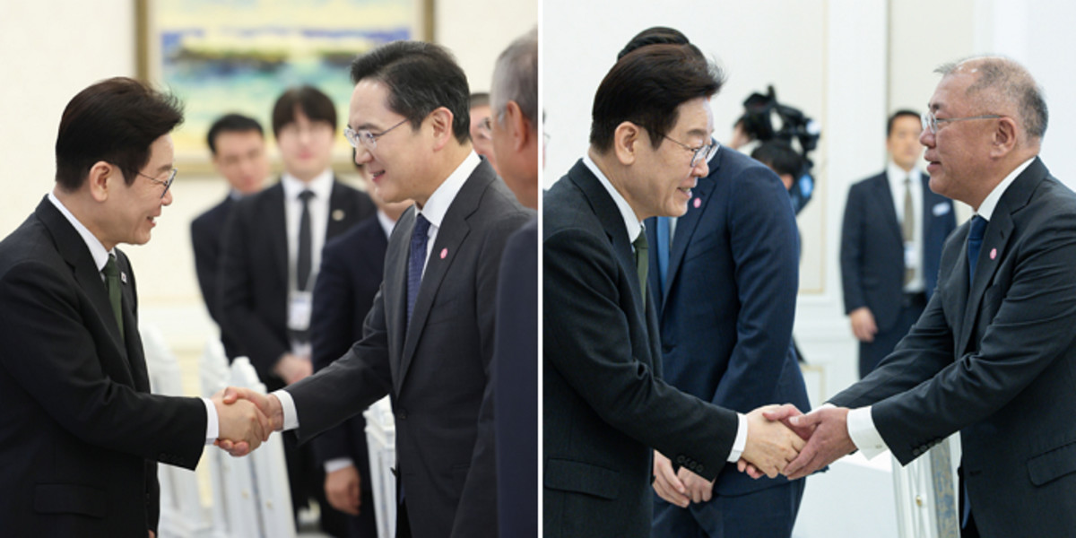 이재명 대통령이 4일 청와대에서 열린 청년일자리와 지방투자 확대를 위한 기업간담회에서 정의선 현대차그룹 회장과 인사를 나누고 있다 / 뉴스1
